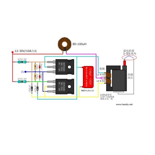 • Generally use 12-30V DC power supply, the current also need more than 10A more appropriate , because the drive board is working in the zero voltage switch state ( Zero Voltage Switching) , his efficiency is the highest, the other The driver is unmatched, the higher the voltage the longer the arc (I personally test with 27V / 15A switching power supply can pull more than 80MM arc, the basic heat), you can also do induction heating or quenching, this is the voltage The higher the faster the heating, while the greater the heat, it is recommended to heat the solid diameter of the coil does not exceed 2/3.